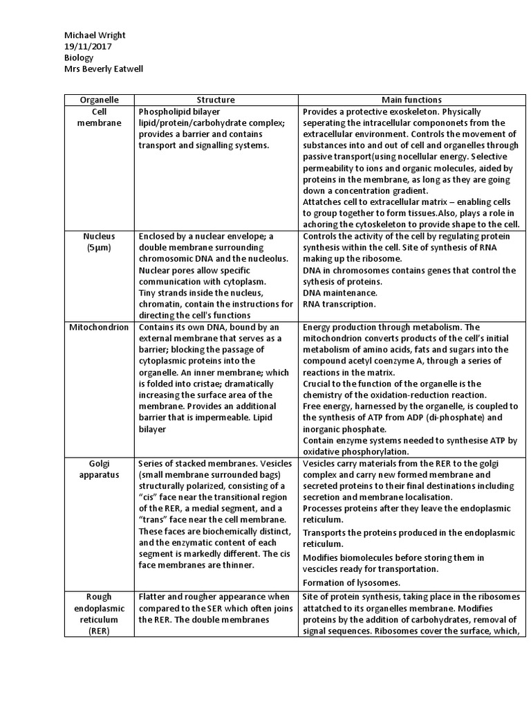 Ask the groups to write on learnings from the video using google docs. Remember, this is a test grade. Complete the following table by writing the name of the cellorganelle in the right hand column that matches the structure/function in the left hand column.